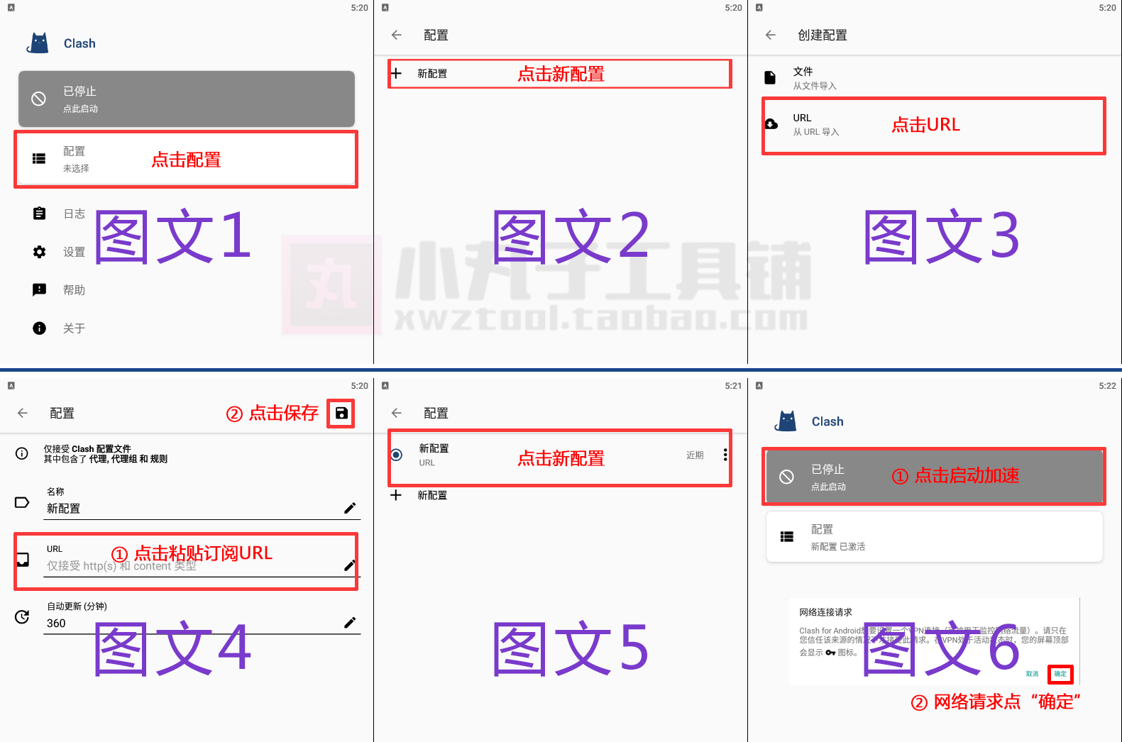 添加小猫咪APP订阅并启动服务 打开小猫咪图标APP,点击「配置」新建配置,在「URL」栏填入订阅URL并保存,启用「新配置」启动加速服务首次启用会有「网络连接请求」点 「确定」