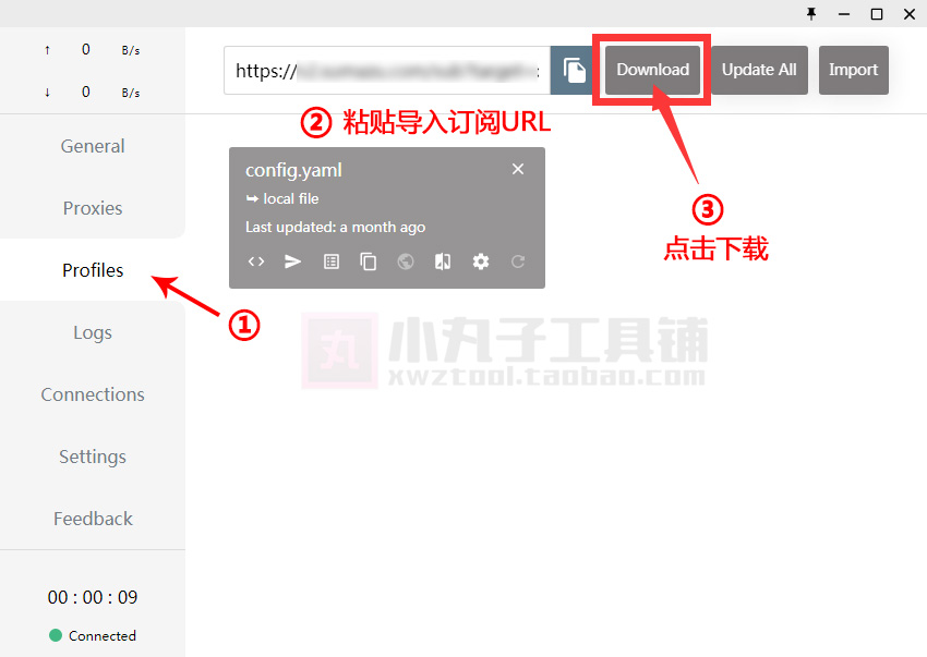 添加小猫咪订阅 启动Clash for Windows小猫咪应用程序,点击①「Profiles」, 在②导入您的URL订阅链接(可用快捷键 Ctrl+V 粘贴) ,然后点击③按钮下载订阅。