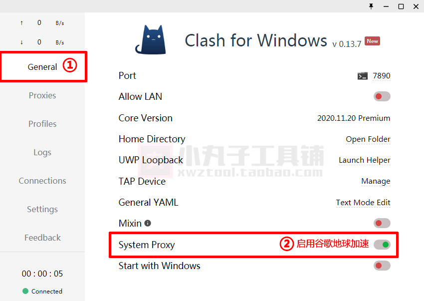 开启小猫咪服务 点击①「General」, 点击②开启小猫咪服务。